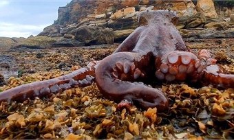 Daily Mail сообщает о нахождении местным жителем огромного голодного осьминога на побережье Сиднея (Австралия). Морской моллюск преодолевал каменные валуны и вполне спокойно чувствовал себя на суше.